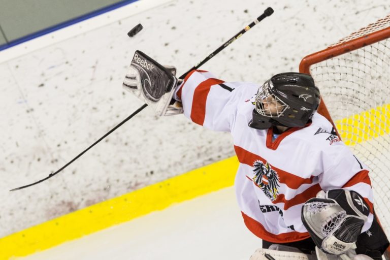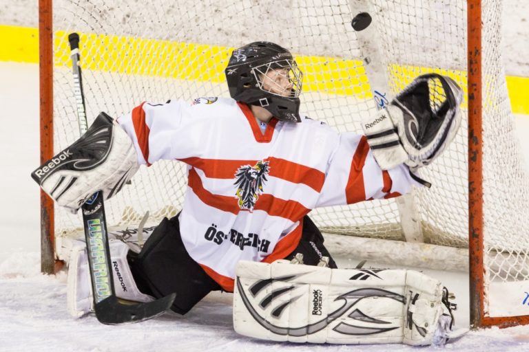 Brankárka Rakúska Nicole Arnberger počas medzištátneho prípravného hokejového zápasu žien Slovensko - Rakúsko. Bratislava, 29. marec 2014. Foto: SITA/Jozef Jakubčo