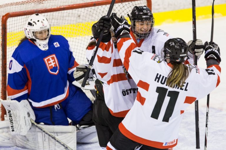 Zľava: Brankárka Slovenska Romana Kiapešová a hráčky Rakúska počas medzištátneho prípravného hokejového zápasu žien Slovensko - Rakúsko. Bratislava, 29. marec 2014. Foto: SITA/Jozef Jakubčo