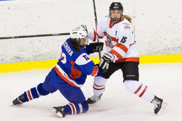 Zľava: Hráčka Slovenska Denisa Lalíková a hráčka Rakúska Anna Hanser počas medzištátneho prípravného hokejového zápasu žien Slovensko - Rakúsko. Bratislava, 29. marec 2014. Foto: SITA/Jozef Jakubčo