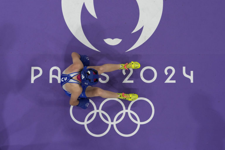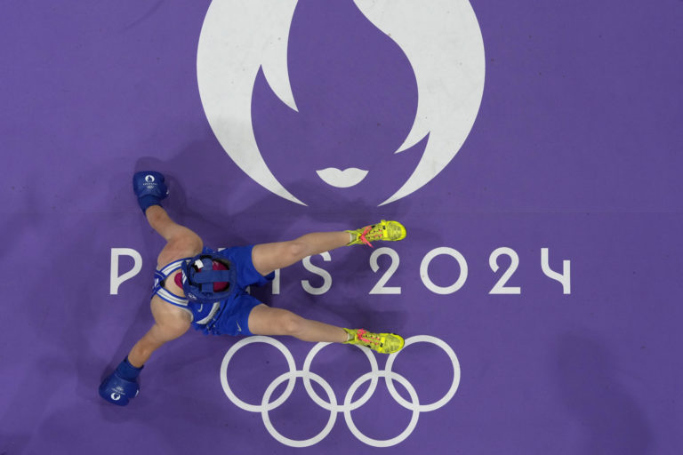 Slovenská boxerka Jessica Triebelova počas zápasu proti Alcinde dos Santosovej z Mozambiku v kategórii do 66 kg na letnej olympiáde v Paríži. Paríž, 28. júl 2024. Foto: SITA/AP.