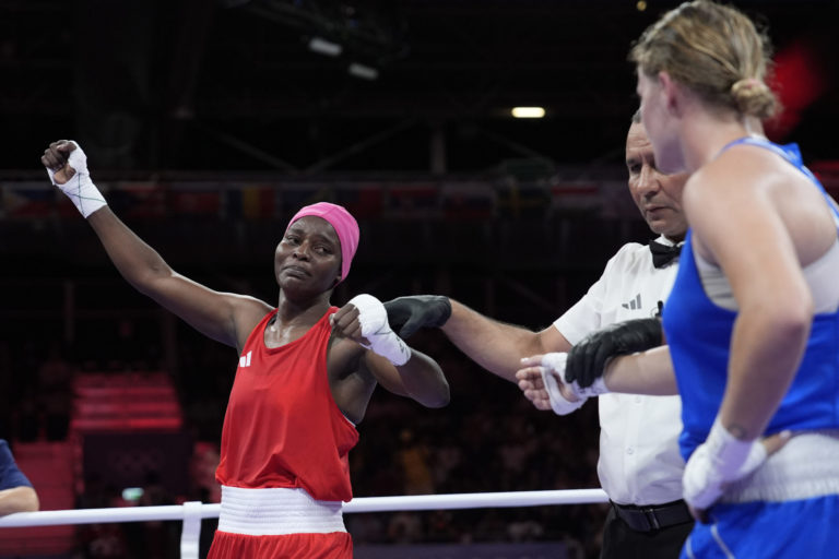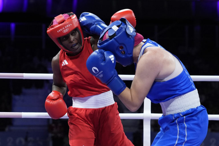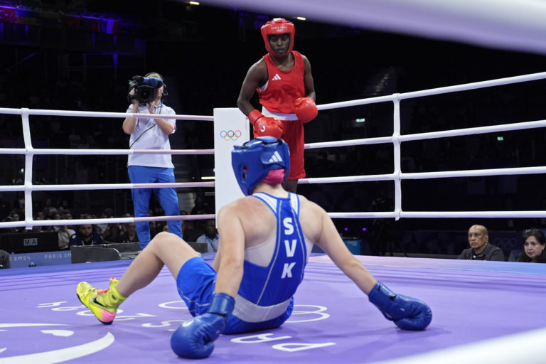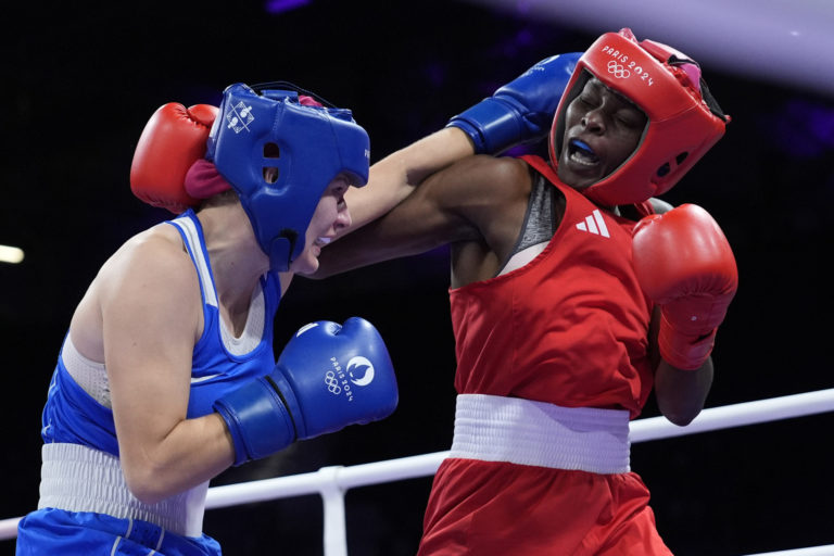 Slovenská boxerka Jessica Triebeľová a Alcinda dos Santosová z Mozambiku počas zápasu v kategórii do 66 kg na letnej olympiáde v Paríži. Paríž, 28. júl 2024. Foto: SITA/AP.