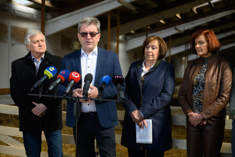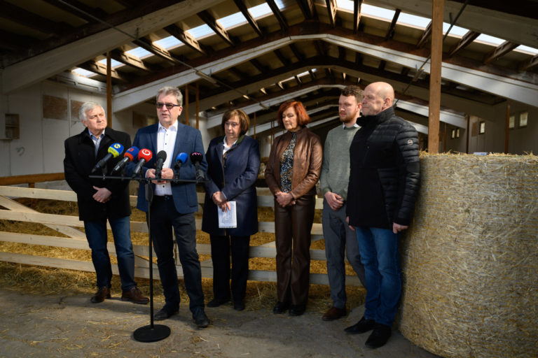 Zľava: Predseda predstavenstva Zväzu chovateľov oviec a kôz Igor Nemčok, predseda Výboru NR SR pre pôdohospodárstvo a životné prostredie Jaroslav Karahuta, generálna tajomníčka služobného úradu MPRV SR Zuzana Nouzovská a členka Výkonného výboru Vidieckej platformy Anna Balková počas tlačového brífingu Ministerstva pôdohospodárstva a rozvoja vidieka (MPRV) SR v Poľnohospodárskom družstve (PD) Liptovské Revúce na tému: Slovenská jahňacina patrí medzi najkvalitnejšie. Liptovské Revúce, 20. marec 2023. Foto: SITA/Miloslav Fabian