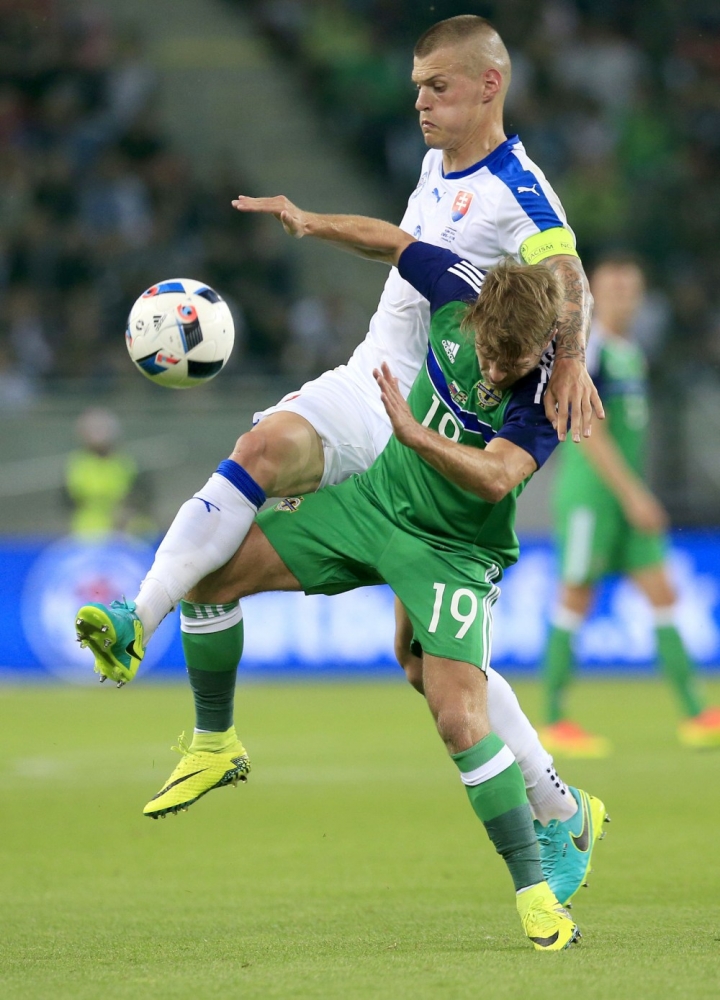 Sprava pri lopte: Hráč Slovenska Michal Ďuriš a hráč Severného Írska Gareth McAuley počas prípravného medzištátneho futbalového zápasu Slovensko - Severné Írsko. Trnava, 4. jún 2016. Foto: SITA/Ivan Kopčáni
