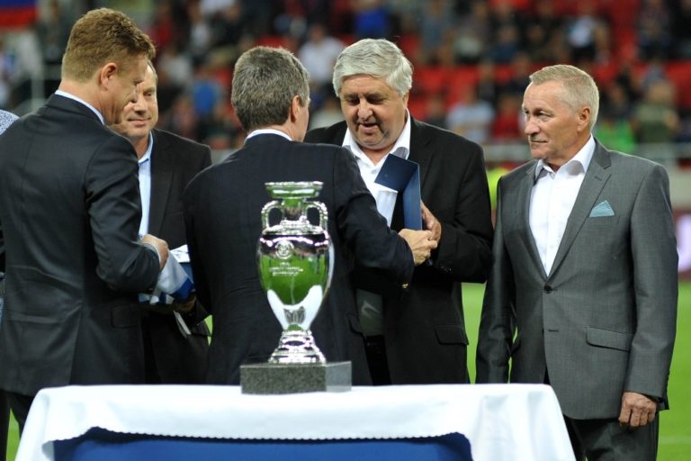 Majstri Európy z roku 1976 pri preberaní plakiet počas prípravného medzištátneho futbalového zápasu Slovensko - Severné Írsko. Trnava, 4. jún 2016. Foto: SITA/Ivan Kopčáni