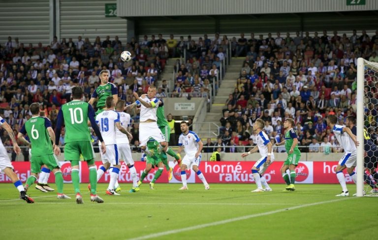 Závar pred slovenskou bránou počas prípravného zápasu medzi Slovenskom a Severným Írskom. Foto: SITA/AP