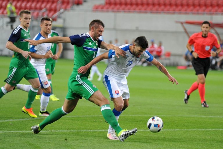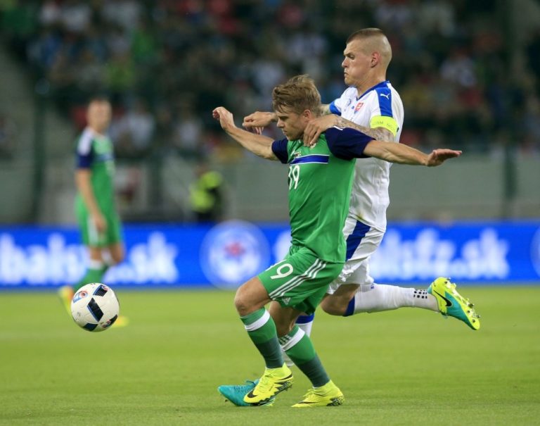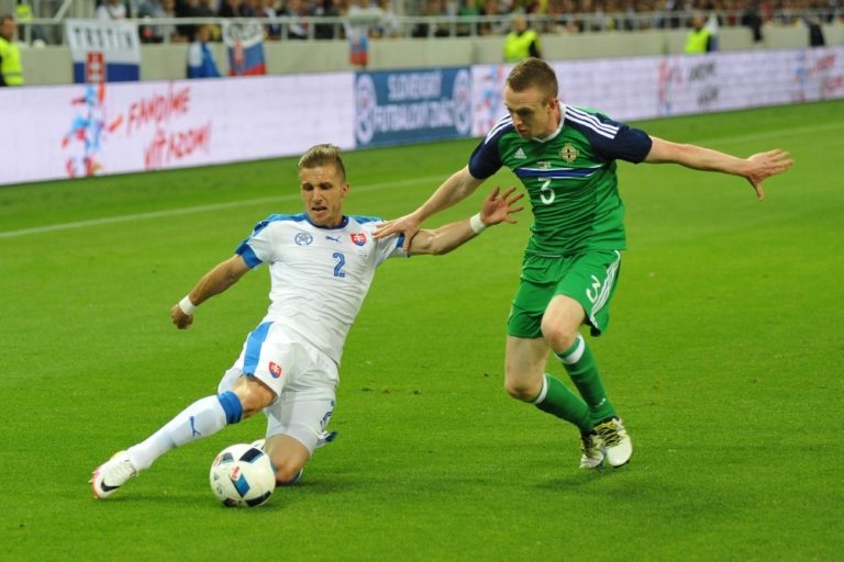 Zľava: Hráč Slovenska Peter Pekarík a hráč Severného Írska Shane Ferguson počas prípravného medzištátneho futbalového zápasu Slovensko - Severné Írsko. Trnava, 4. jún 2016. Foto: SITA/Ivan Kopčáni