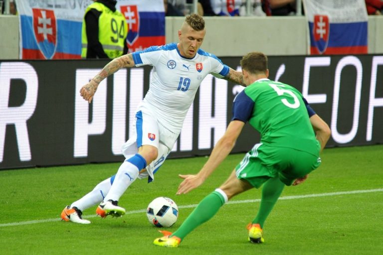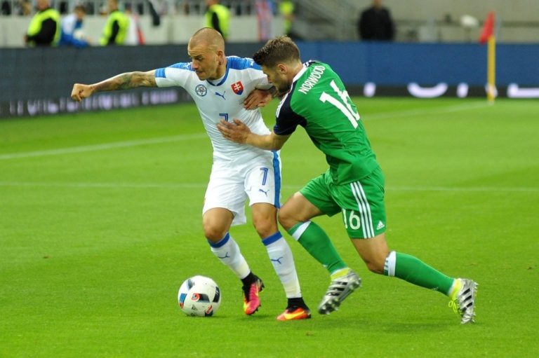 Zľava: Hráč Slovenska Juraj Kucka a hráč Severného Írska Jonny Evans počas prípravného medzištátneho futbalového zápasu Slovensko - Severné Írsko. Trnava, 4. jún 2016. Foto: archívne, SITA/Ivan Kopčáni