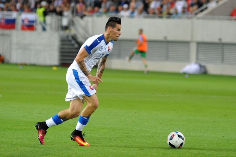 Hráč Slovenska Marek Hamšík počas prípravného medzištátneho futbalového zápasu Slovensko - Severné Írsko. Trnava, 4. jún 2016. Foto: SITA/Ivan Kopčáni