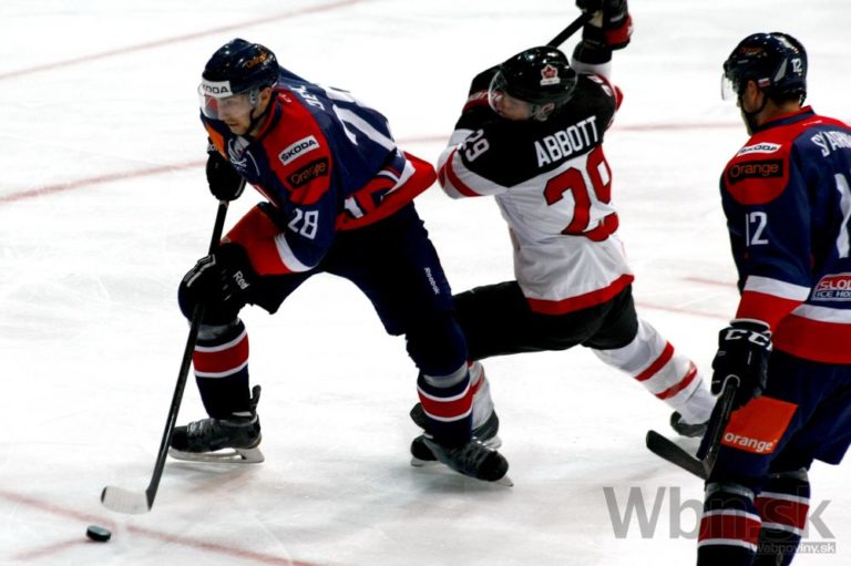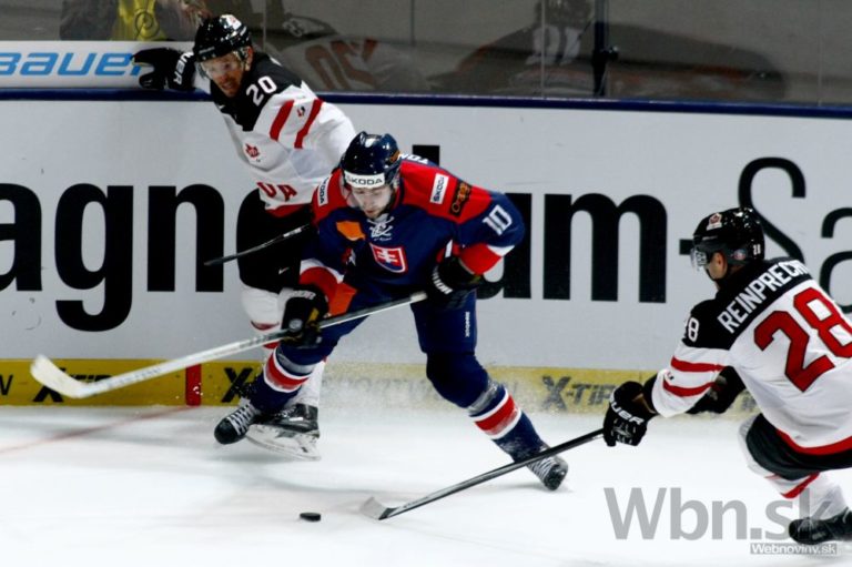 Roman Tománek (v strede) zo Slovenska a Steven Reinprecht (vpravo) a Connor James (vľavo) z Kanady počas hokejového zápasu na Nemeckom pohári 2014 v Mníchove. Mníchov, Nemecko, 7. november 2014. Foto: SITA/Rainer Gmach