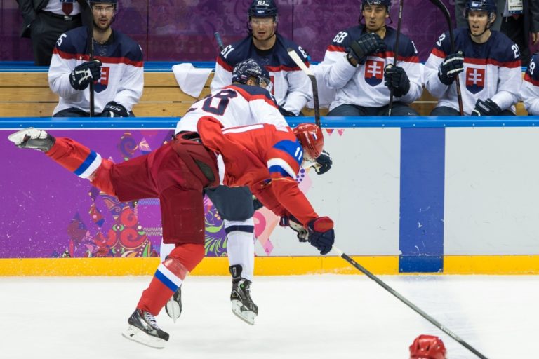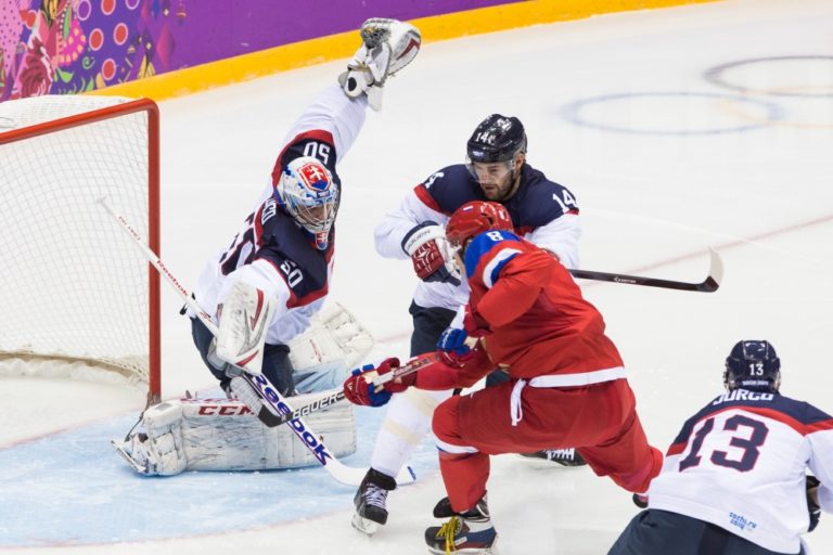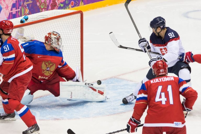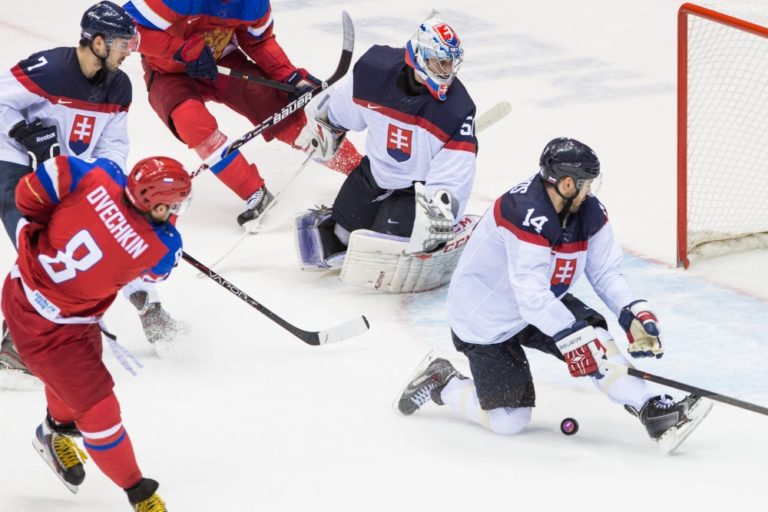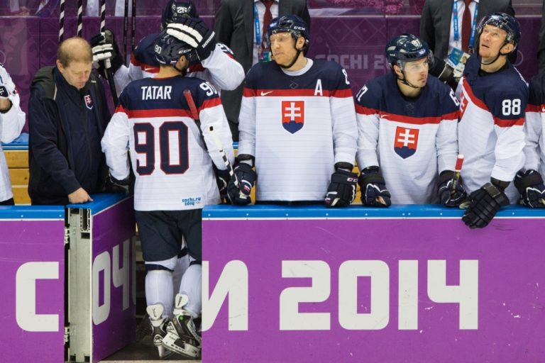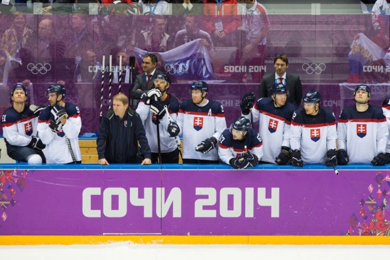 Hráči Slovenska počas zápasu Rusko - Slovensko v základnej A skupine na ZOH 2014 v Soči. Rusko, Soči, 16. február 2014. Foto: SITA/Jozef Jakubčo