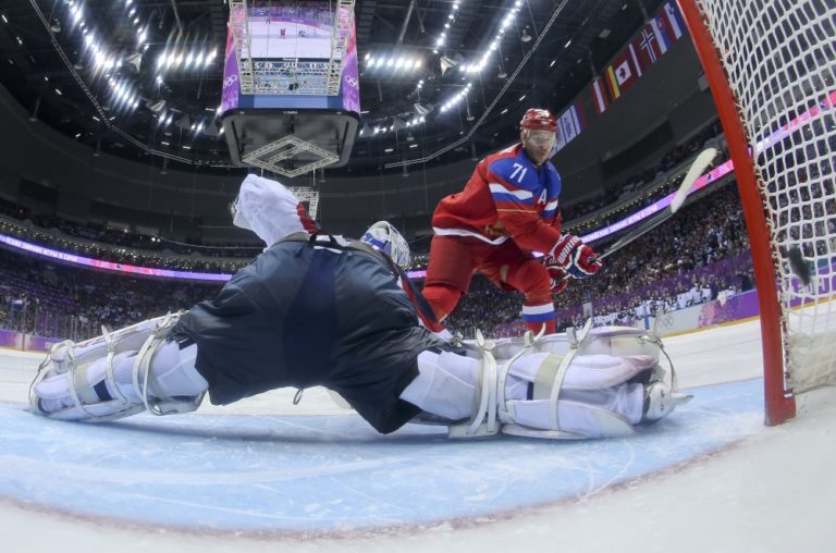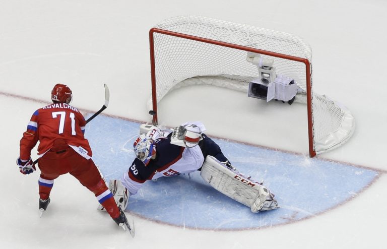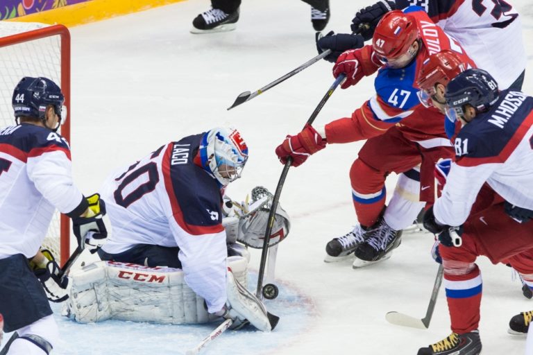 Zľava: Brankár Slovenska Ján Laco a hráč Ruska Iľja Kovaľčuk počas zápasu Rusko - Slovensko v základnej A skupine na ZOH 2014 v Soči. Rusko, Soči, 16. február 2014. Foto: SITA/Jozef Jakubčo