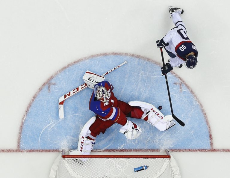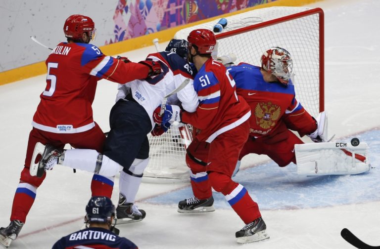 Sprava: Brankár Ruska Semion Varlamov a hráč Slovenska Milan Bartovič počas zápasu Rusko - Slovensko v základnej A skupine na ZOH 2014 v Soči. Rusko, Soči, 16. február 2014. Foto: SITA/Jozef Jakubčo