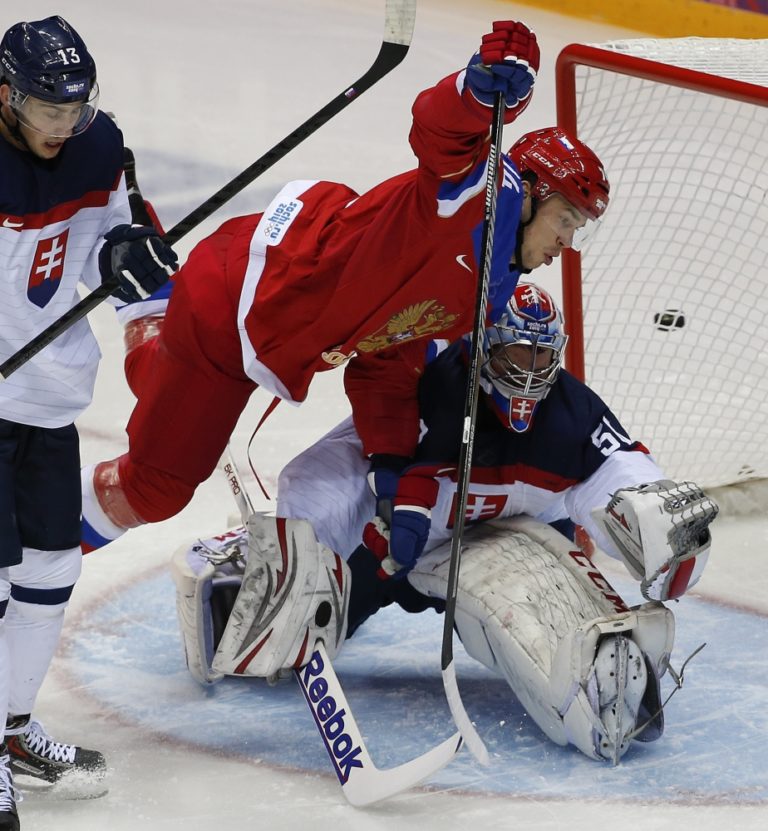 Sprava: Brankár Slovenska Ján Laco a hráč Ruska Iľja Kovaľčuk počas zápasu Rusko - Slovensko v základnej A skupine na ZOH 2014 v Soči. Rusko, Soči, 16. február 2014. Foto: SITA/Jozef Jakubčo
