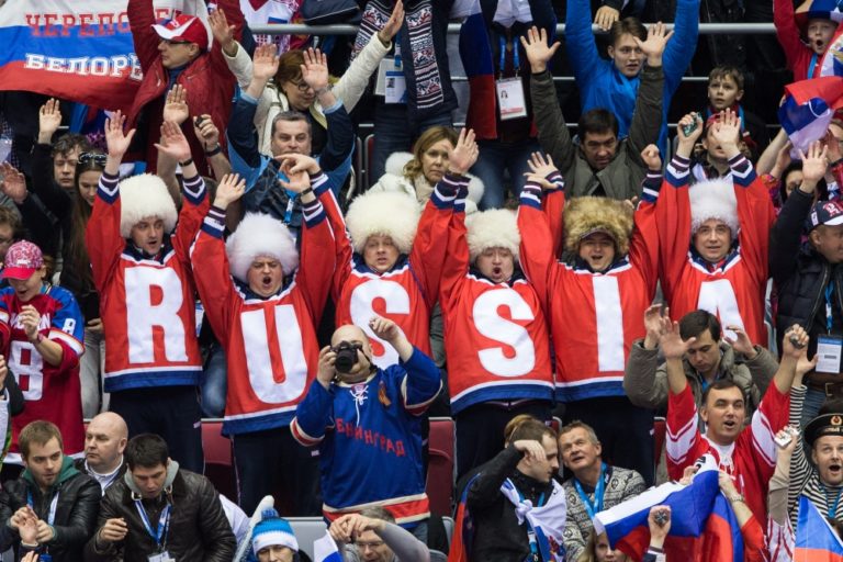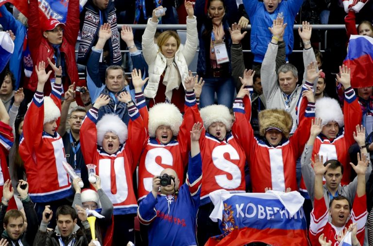 Fanúšikovia Ruska počas zápasu Rusko - Slovensko v základnej A skupine na ZOH 2014 v Soči. Rusko, Soči, 16. február 2014. Foto: SITA/AP