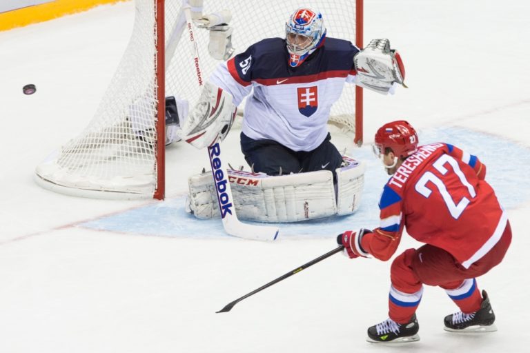 Zľava: Brankár Slovenska Ján Laco a hráč Ruska Alexej Tereščenko počas zápasu Rusko - Slovensko v základnej A skupine na ZOH 2014 v Soči. Rusko, Soči, 16. február 2014. Foto: SITA/Jozef Jakubčo