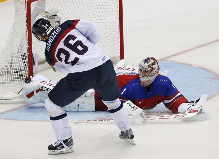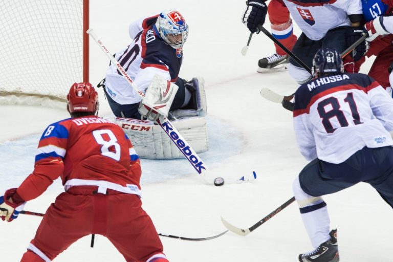 Brankár Slovenska Ján Laco počas zápasu Rusko - Slovensko v základnej A skupine na ZOH 2014 v Soči. Rusko, Soči, 16. február 2014. Foto: SITA/Jozef Jakubčo