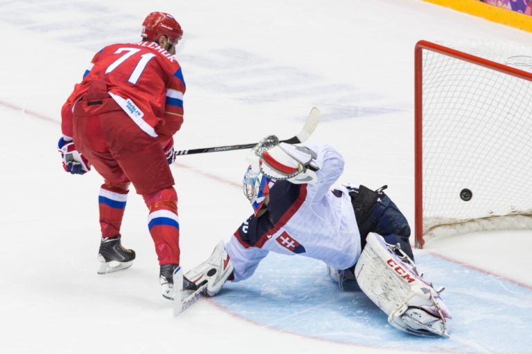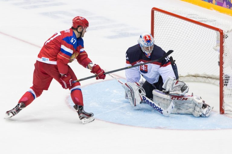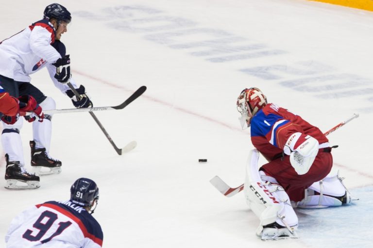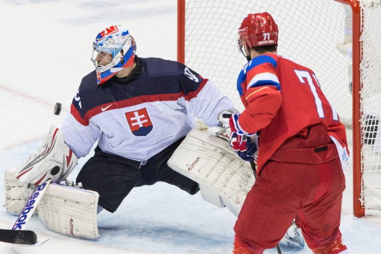 Slovenského brankára Jána Laca prekonal v samostatných nájazdoch okrem Alexandra Radulova aj Iľja Kovaľčuk. Foto: SITA/AP