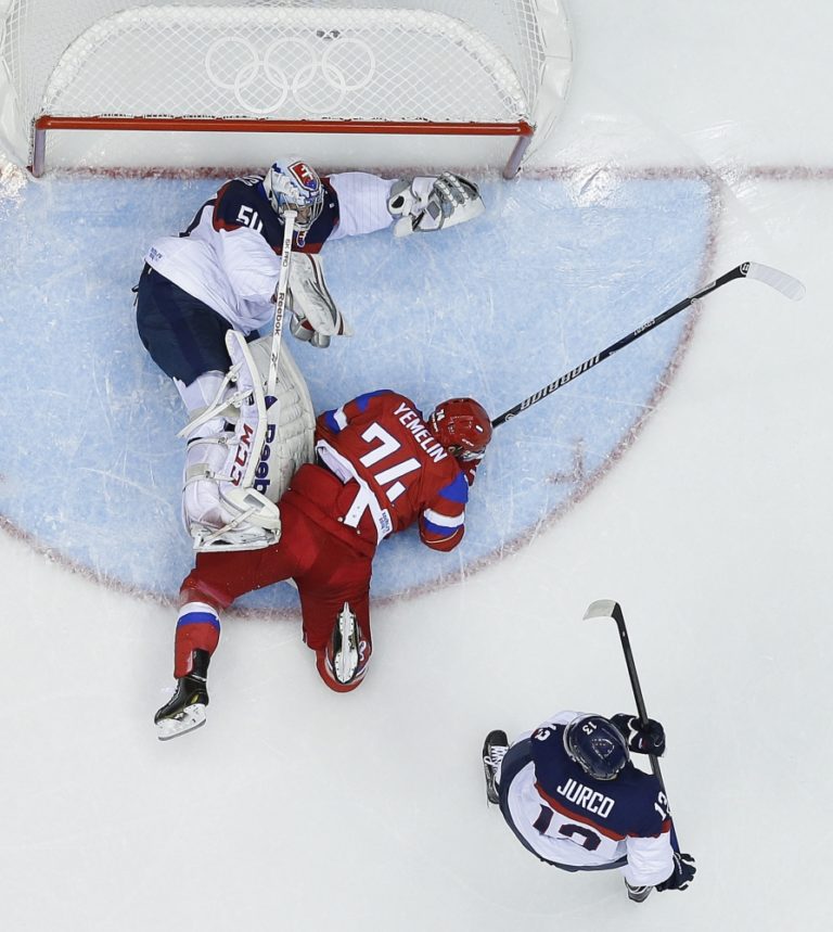 Slovenský útočník Tomáš Jurčo v súboji s ruským obrancom Alexejom Jemelinom pred brankárom Jánom Lacom počas nedeľňajšieho zápasu na olympijskom turnaji v Soči. Foto: SITA/AP