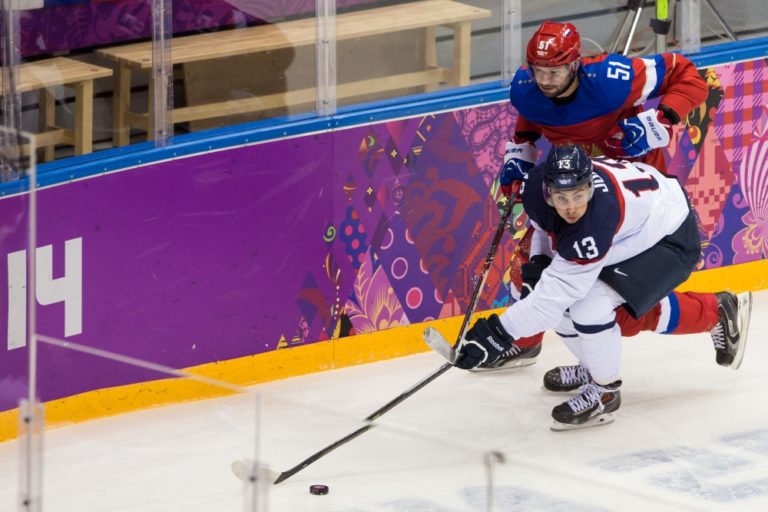Zľava: Hráč Ruska Alexander Radulov a hráč Slovenska Zdeno Chára počas zápasu Rusko - Slovensko v základnej A skupine na ZOH 2014 v Soči. Rusko, Soči, 16. február 2014. Foto: SITA/Jozef Jakubčo