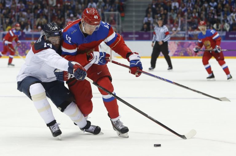 Slovenský útočník Branko Radivojevič v súboji s Rusom Vladimirom Tarasenkom počas nedeľňajšieho zápasu na olympijskom turnaji v Soči. Foto: SITA/AP