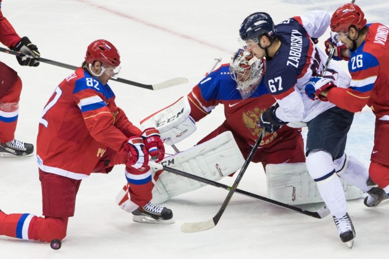 Zľava: Hráč Ruska Yevgeni Medvedev, brankár Ruska Semion Varlamov a hráč Slovenska Tomáš Záborský počas zápasu Rusko - Slovensko v základnej A skupine na ZOH 2014 v Soči. Rusko, Soči, 16. február 2014. Foto: SITA/Jozef Jakubčo