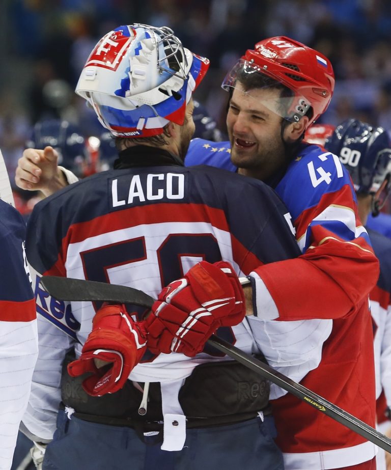 Slovenský brankár Ján Laco a ruský útočník Alexander Radulov po nedeľňajšom zápase na olympijskom turnaji v Soči. Foto: SITA/AP
