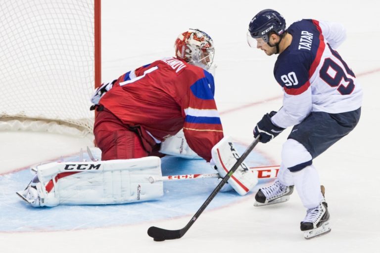 Sprava: Hráč Slovenska Tomáš Tatar a brankár Ruska Semion Varlamov počas zápasu Rusko - Slovensko v základnej A skupine na ZOH 2014 v Soči. Rusko, Soči, 16. február 2014. Foto: SITA/Jozef Jakubčo