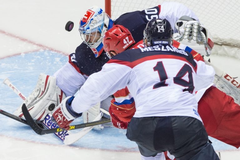 Sprava: Hráč Slovenska Andrej Meszároš a brankár Slovenska Ján Laco počas zápasu Rusko - Slovensko v základnej A skupine na ZOH 2014 v Soči. Rusko, Soči, 16. február 2014. Foto: SITA/Jozef Jakubčo
