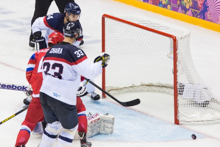 Hráč Slovenska Andrej Sekera (vľavo) počas zápasu Rusko - Slovensko v základnej A skupine na ZOH 2014 v Soči. Rusko, Soči, 16. február 2014. Foto: SITA/Jozef Jakubčo