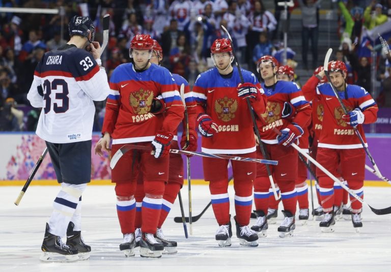 Slovenský obranca Zdeno Chára a ruský hokejisti po nedeľňajšom zápase na olympijskom turnaji v Soči. Foto: SITA/AP