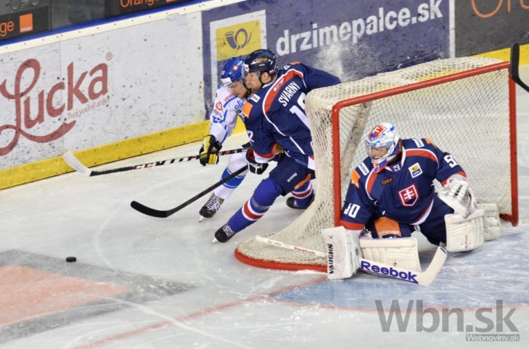 Zľava: Hráč Slovenska Miroslav Šatan a hráč Fínska Tomi Sallinen počas prípravného zápasu v rámci Euro Hockey Challenge Slovensko - Fínsko . Poprad, 26. apríl 2014. Foto: SITA/Radoslav Maťaš