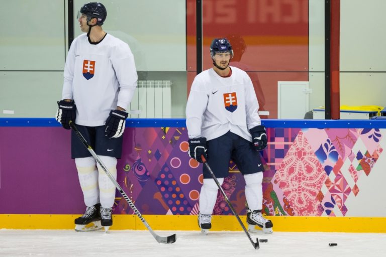 Zľava: Hráči slovenskej hokejovej reprezentácie Tomáš Tatár a Zdeno Chára počas tréningu pred prvým zápasom na ZOH 2014 v Soči. Rusko, Soči, 10. február 2014. Foto: SITA/Jozef Jakubčo