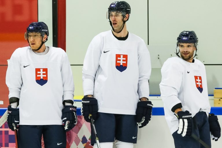 Zľava: Hráči slovenskej hokejovej reprezentácie Marián Hossa, Zdeno Chára a Andrej Sekera počas tréningu pred prvým zápasom na ZOH 2014 v Soči. Rusko, Soči, 10. február 2014. Foto: SITA/Jozef Jakubčo