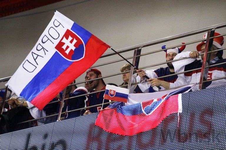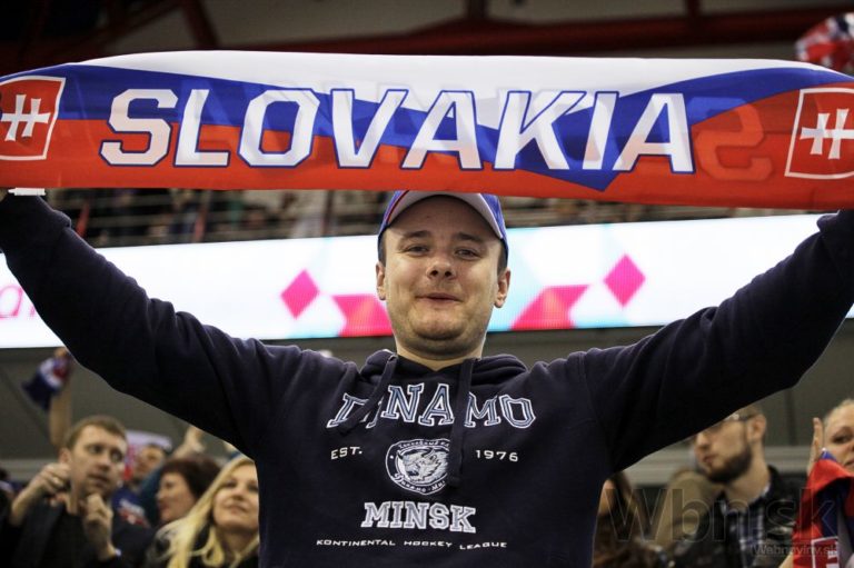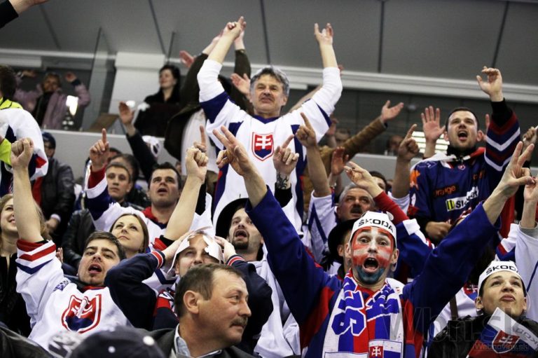 Fanúšikovia zo Slovenska počas zápasu Slovensko - Nórsko základnej A-skupiny majstrovstiev sveta v ľadovom hokeji 2014 v Minsku. Bielorusko, Minsk, 14. máj 2014. Foto: SITA/Ján Viazanička