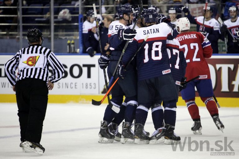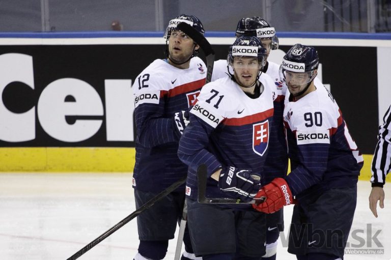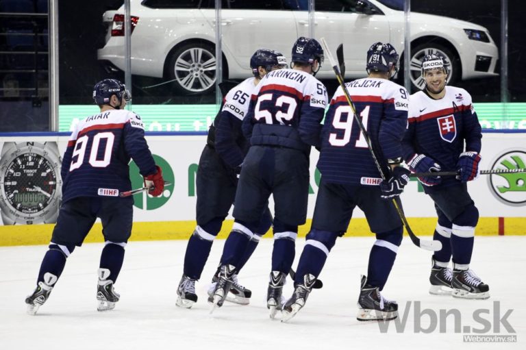 Radosť hráčov Slovenska po strelení úvodného gólu, na snímke Juraj Mikuš (druhý zľava) počas zápasu Slovensko - Nórsko základnej A-skupiny majstrovstiev sveta v ľadovom hokeji 2014 v Minsku. Bielorusko, Minsk, 14. máj 2014. Foto: SITA/Ján Viazanička