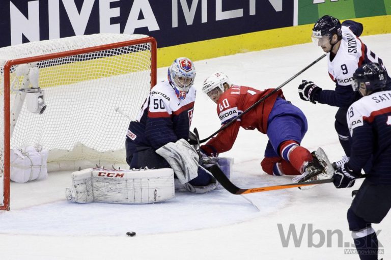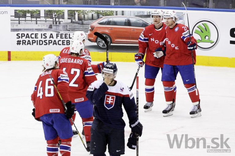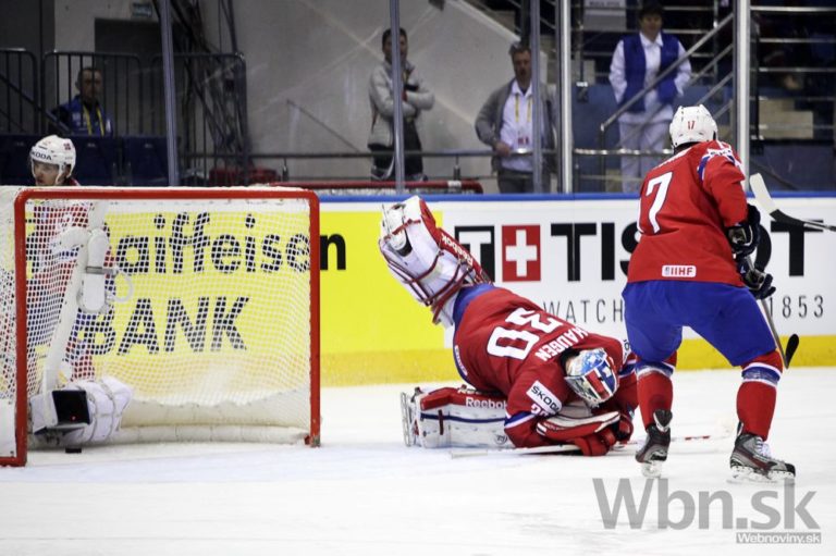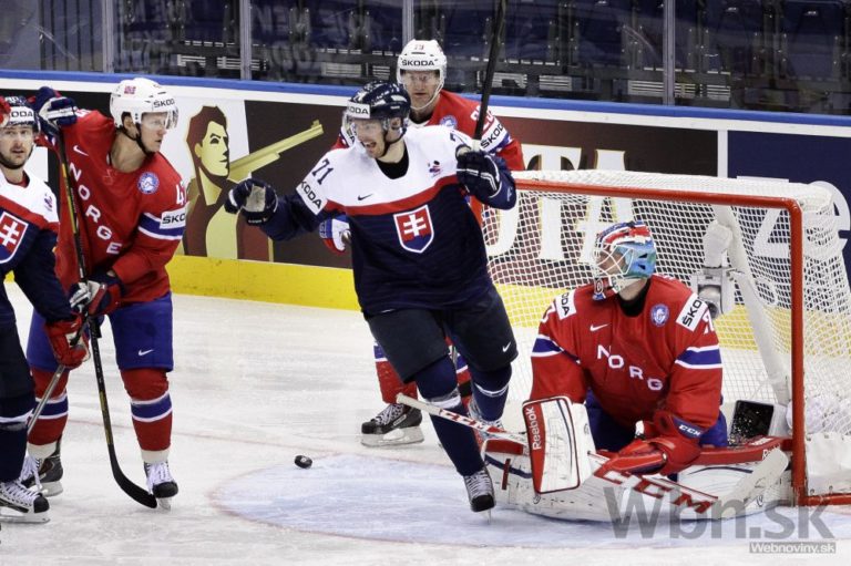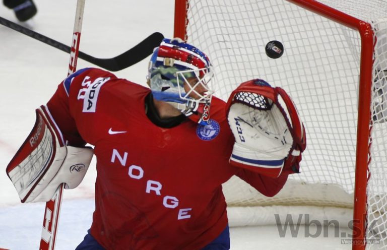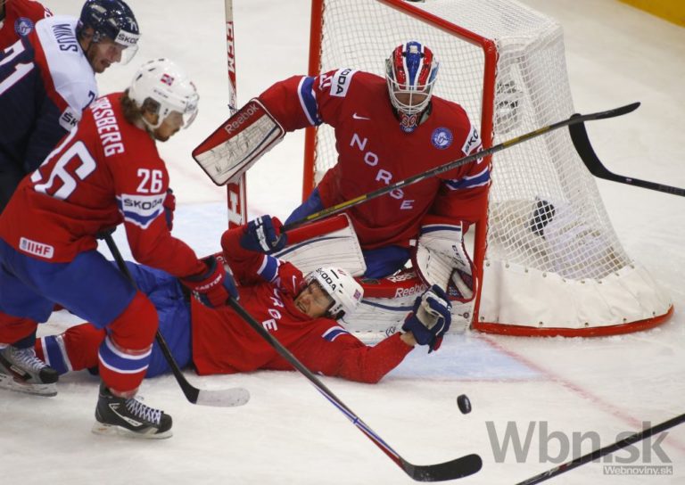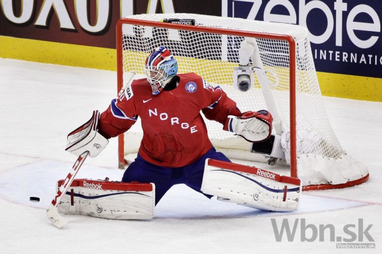 Nórsky brankár Lars Hauges sa bezmocne pozerá ako puk z hokejky slovenského útočníka Ladislava Nagya končí v jeho sieti počas stredajšieho zápasu na MS v hokeji. Foto: SITA/AP