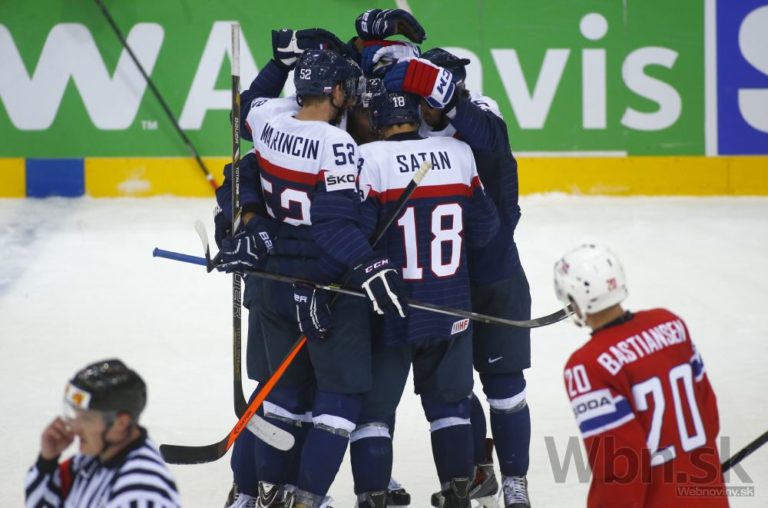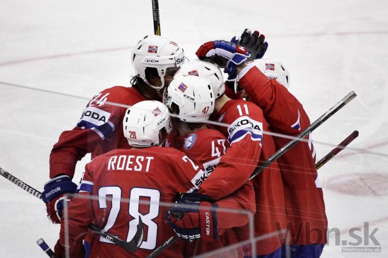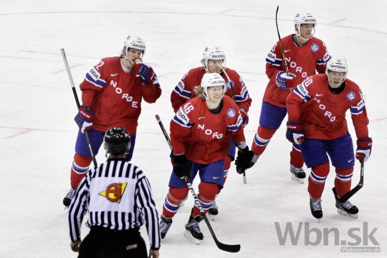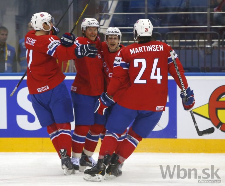 Radosť nórskych hokejistov po góle v sieti Slovenska počas stredajšieho zápasu na svetovom šampionáte v Minsku. Foto: SITA/AP