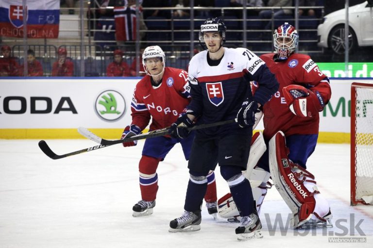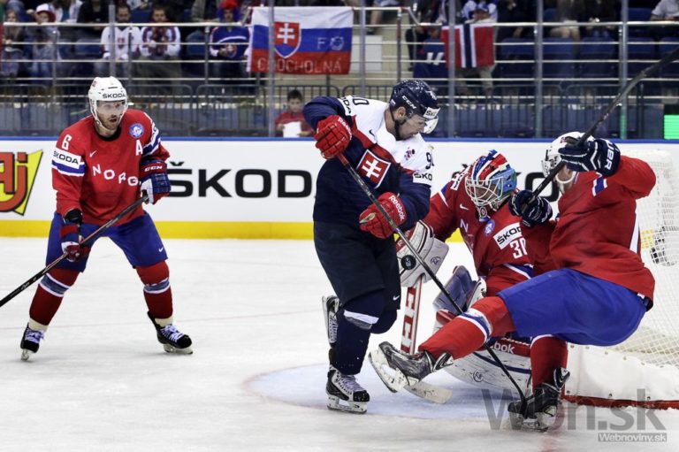 Slovenský útočník Juraj Mikúš v súboji s nórskymi hokejistami pred brankárom Larsom Haugenom počas stredajšieho zápasu na svetovom šampionáte. Foto: SITA/AP