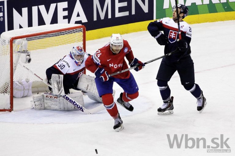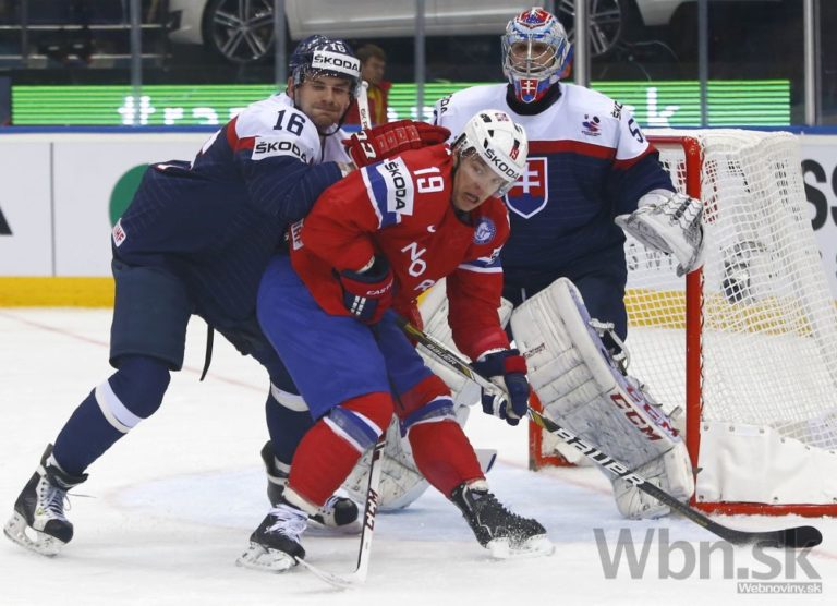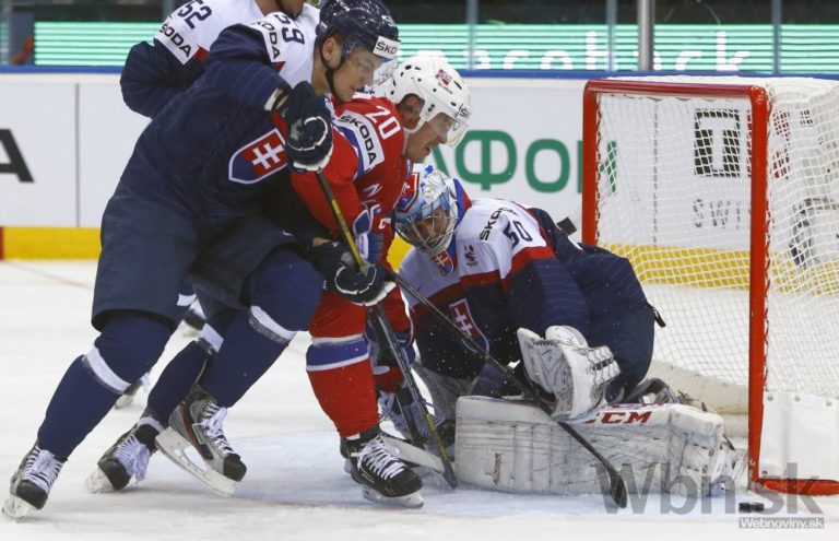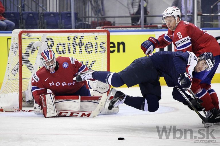 Nór Anders Bastiansen v súboji so slovenským obrancom Andrejom Šťastným pred brankárom Jánom Lacom počas stredajšieho zápasu na MS v hokeji. Foto: SITA/AP