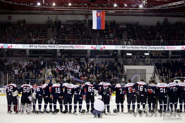 Hráči Slovenska po zápase Slovensko - Nórsko základnej A-skupiny majstrovstiev sveta v ľadovom hokeji 2014 v Minsku. Bielorusko, Minsk, 14. máj 2014. Foto: SITA/Ján Viazanička