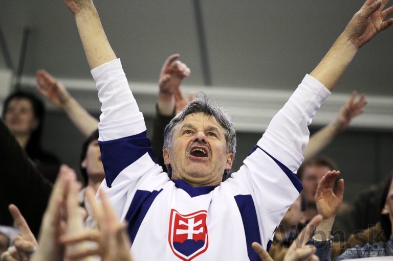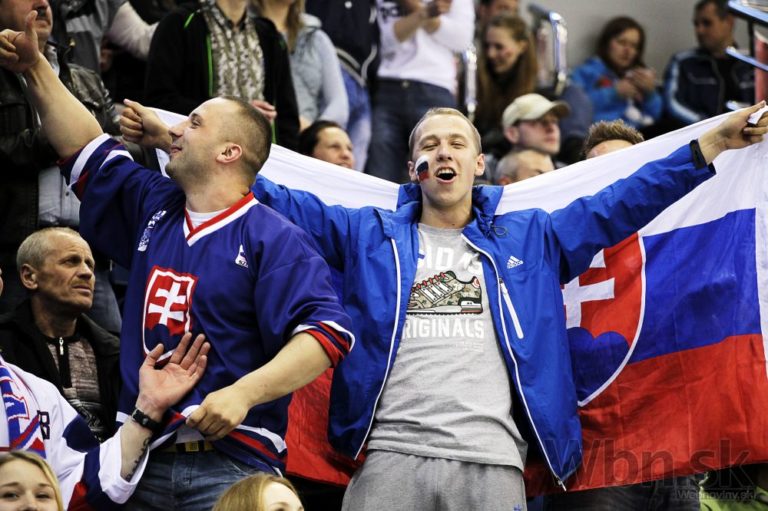 Radosť slovenských fanúšikov z víťazstva nad Nórskom po zápase Slovensko - Nórsko základnej A-skupiny majstrovstiev sveta v ľadovom hokeji 2014 v Minsku. Bielorusko, Minsk, 14. máj 2014. Foto: SITA/Ján Viazanička