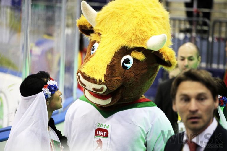 Maskot Volat (uprostred) po zápase Slovensko - Nórsko základnej A-skupiny majstrovstiev sveta v ľadovom hokeji 2014 v Minsku. Bielorusko, Minsk, 14. máj 2014. Foto: SITA/Ján Viazanička