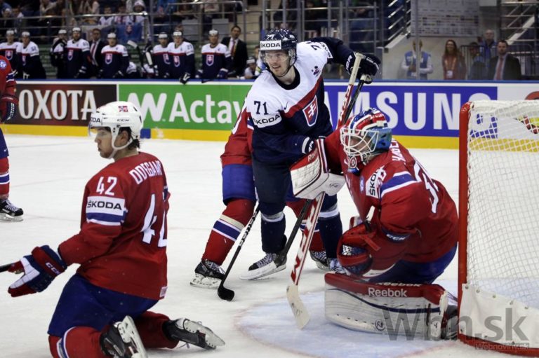 Michel Miklík zo Slovenska (uprostred) počas zápasu Slovensko - Nórsko základnej A-skupiny majstrovstiev sveta v ľadovom hokeji 2014 v Minsku. Bielorusko, Minsk, 14. máj 2014. Foto: SITA/Ján Viazanička