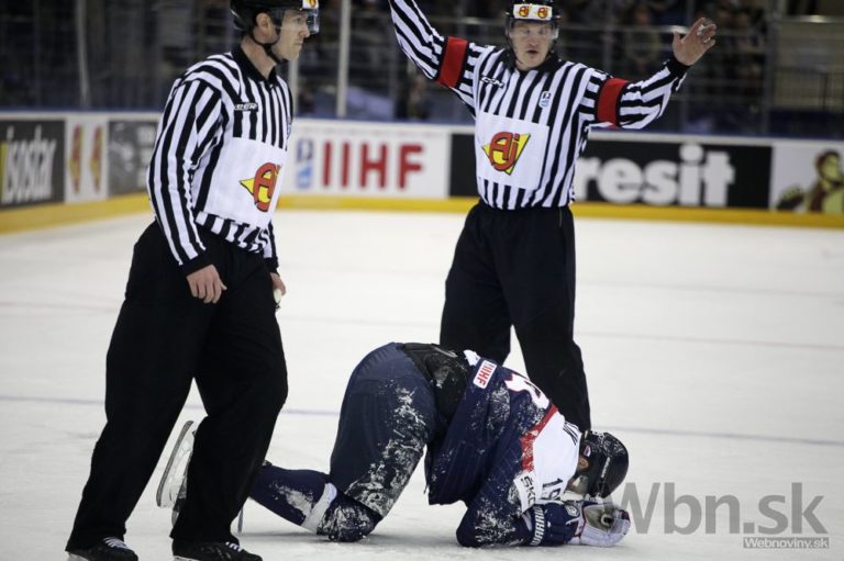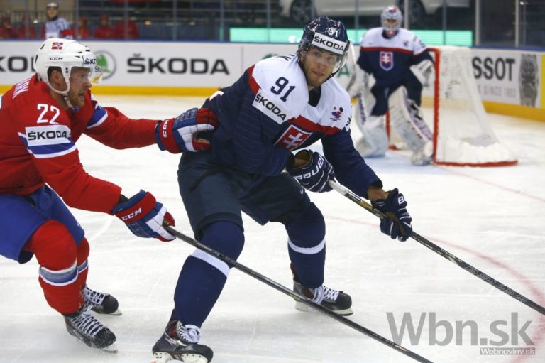 Nórsky útočník Ken Andre Olimb v súboji so slovenským kapitánom Miroslavom Šatanom počas stredajšieho zápasu na MS v hokeji. Foto: SITA/AP