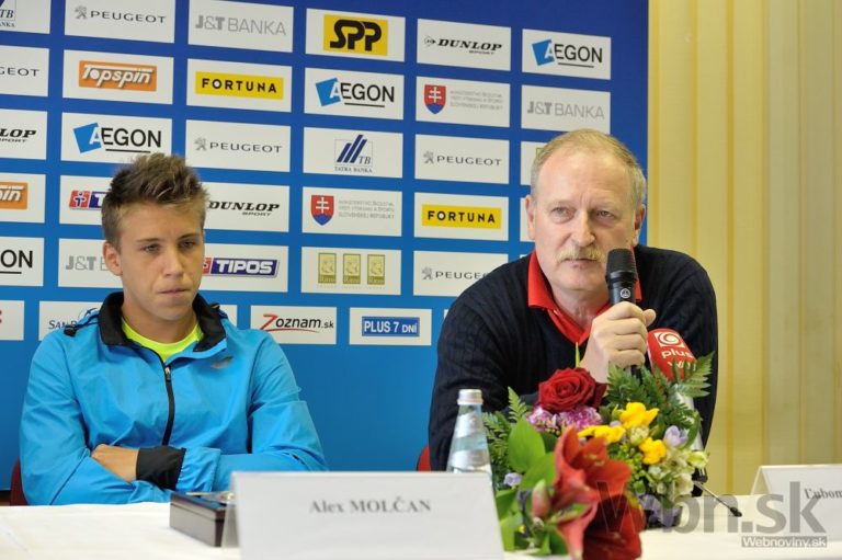Zľava: Tenista Alex Molčan a tréner Ľubomír Kurhajec počas tlačovej konferencie Slovenského tenisového zväzu (STZ) s juniormi a ich trénermi po návrate z Australian Open. Bratislava, 2. február 2015. Foto: SITA/Robert Tappert