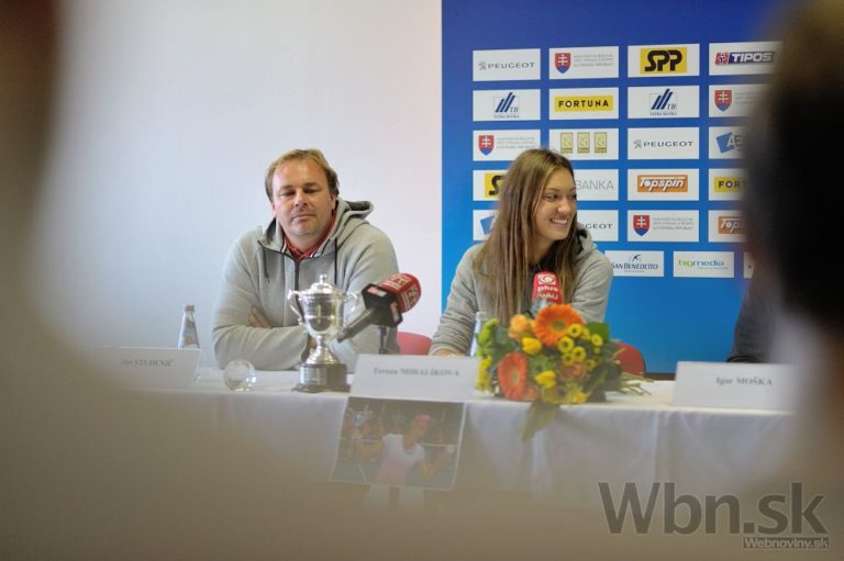 Zľava: Tréner Ján Studenič a tenistka Tereza Mihalíková počas tlačovej konferencie Slovenského tenisového zväzu (STZ) s juniormi a ich trénermi po návrate z Australian Open. Bratislava, 2. február 2015. Foto: SITA/Robert Tappert