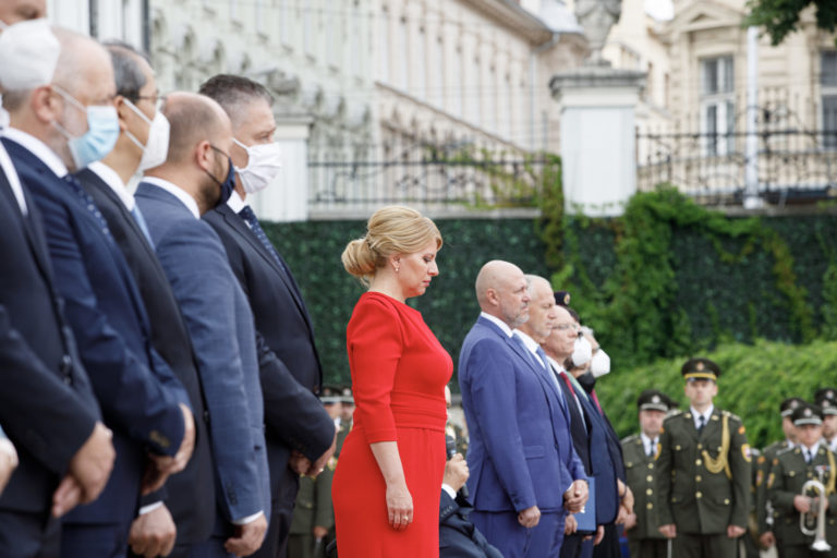 Prezidentka SR Zuzana Čaputová (vľavo v popredí) a prezident Slovenského olympijského a športového výboru (SOV) Anton Siekel (vpravo) počas slávnostného sľubu členov slovenskej výpravy na Hry XXXII. olympiády a na paralympijské hry v Tokiu do rúk prezidentky SR v záhrade Prezidentského paláca. Bratislava, 14. júl 2021. Foto: SITA/Branislav Bibel