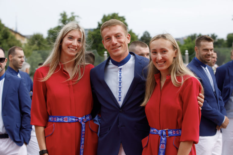Zľava v popredí: Prekážkarka Emma Zapletalová, šprintér Ján Volko a bežkyňa Gabriela Gajanová počas slávnostného sľubu členov slovenskej výpravy na Hry XXXII. olympiády a na paralympijské hry v Tokiu do rúk prezidentky SR v záhrade Prezidentského paláca. Bratislava, 14. júl 2021. Foto: SITA/Branislav Bibel