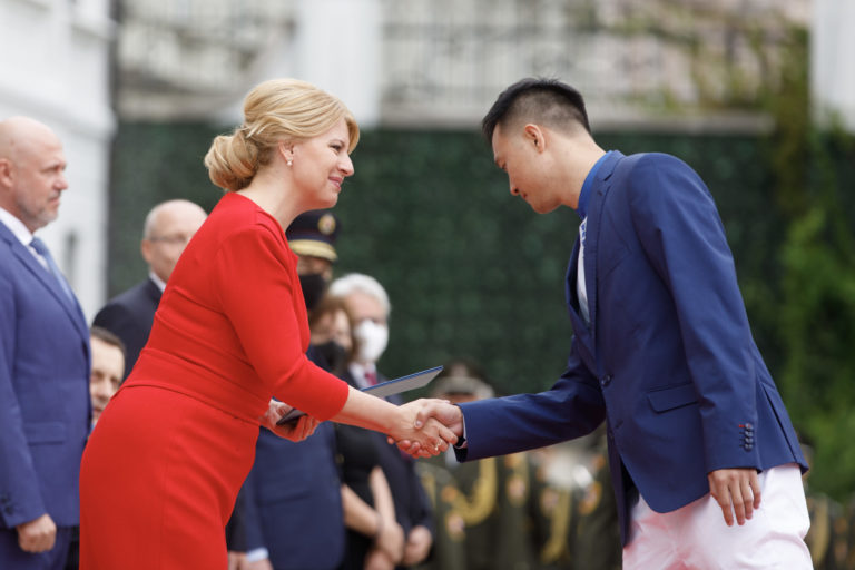 Zľava v popredí: Prezidentka SR Zuzana Čaputová a olympijský reprezentant v stolnom tenise Jang Wang počas slávnostného sľubu členov slovenskej výpravy na Hry XXXII. olympiády a na paralympijské hry v Tokiu do rúk prezidentky SR v záhrade Prezidentského paláca. Bratislava, 14. júl 2021. Foto: SITA/Branislav Bibel