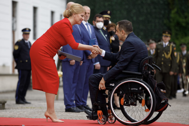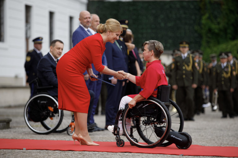 Zľava v popredí: Prezidentka SR Zuzana Čaputová a paralympionička v streľbe Veronika Vadovičová počas slávnostného sľubu členov slovenskej výpravy na Hry XXXII. olympiády a na paralympijské hry v Tokiu do rúk prezidentky SR v záhrade Prezidentského paláca. Bratislava, 14. júl 2021. Foto: SITA/Branislav Bibel